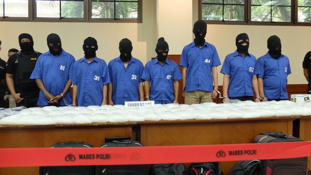 Jakarta - Tujuh tersangka narkoba jaringan internasional dijejerkan di depan barang bukti 63,1 Kg sabu yang ditaruh di atas meja. Para tersangka ini dipakaikan sebo yang menutupi wajah mereka. Hanya mata yang terbuka dengan pandangan lurus ke depan.Soal penutup wajah para tersangka narkoba ini menjadi pertanyaan wartawan dalam jumpa pers yang digelar di ruang Rupatama Mabes Polri, Jalan Trunojoyo, Kebayoran Baru, Jakarta Selatan, Rabu (24/8/2016). Beberapa wartawan meminta penutup wajah 7 tersangka ini dibuka.